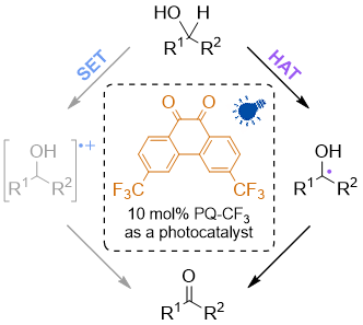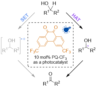 After making some photoredox catalyzed routine alcohol oxidation with phenanthrenequinone (PQ), we discovered that these processes are most intriguing from mechanistic point of view. Moreover, we made a discovery that by tailoring PQ with electron withdrawing CF3 groups the reaction mechanism can be converted from electron transfer to HAT triggered. Electron-Deficient Phenanthrenequinone Derivative for Photoactivated Hydrogen Atom Transfer Mediated Oxidation of Secondary Alcohols J. talvitie et al ChemPhotoChem, 2023, https://doi.org/10.1002/cptc.202300107